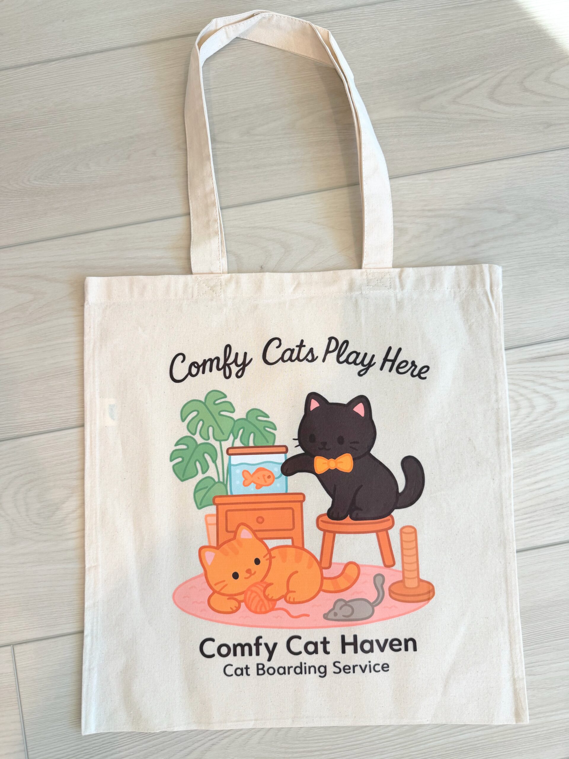 Show your love for cats and the planet with our eco-friendly cotton tote! Each bag is inspired by the cozy spirit of Comfy Cat Haven, our home-based cat boarding service that’s welcomed and cared for hundreds of cats since 2021.